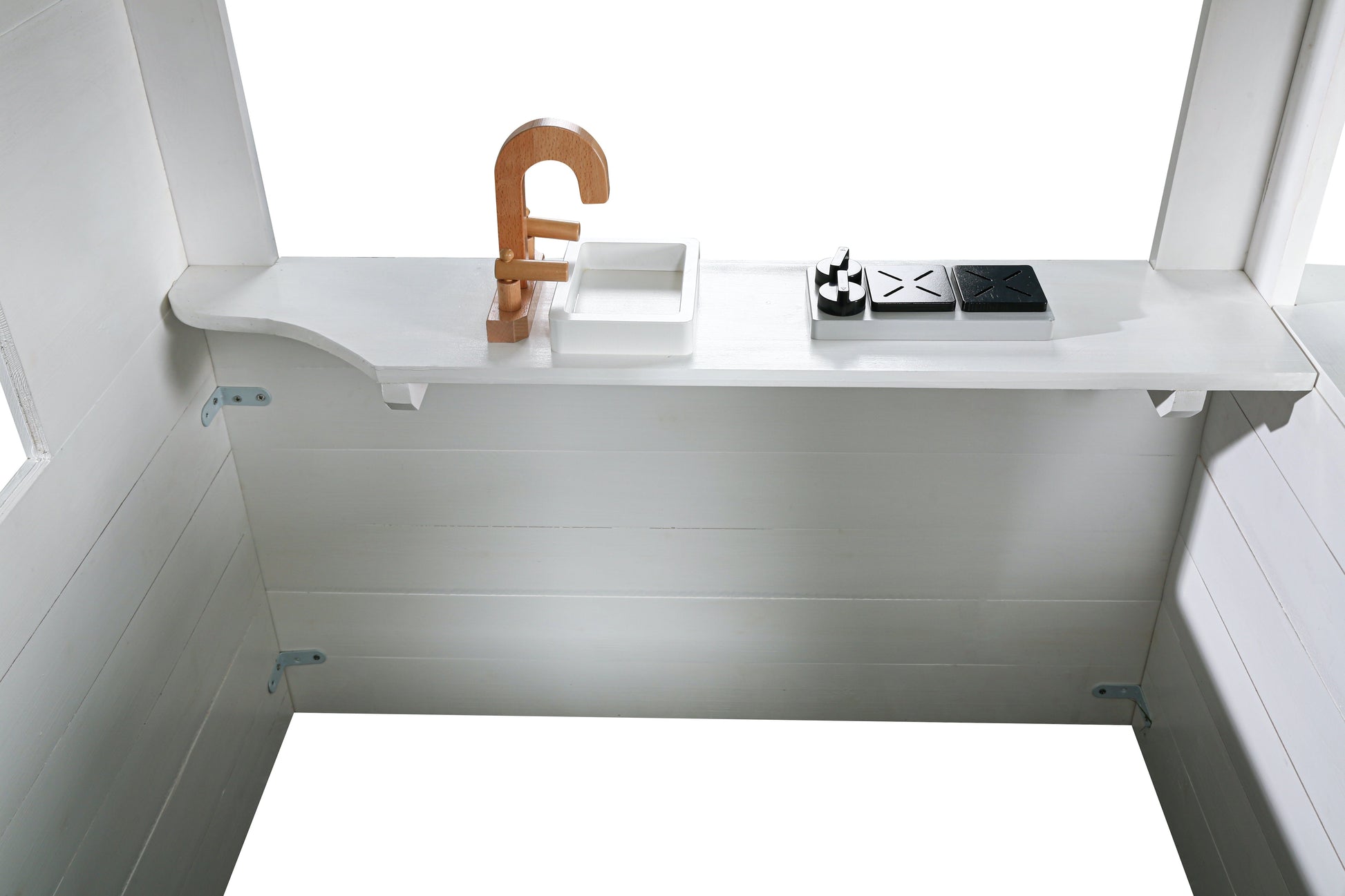 Complete Kitchen Experience: Features a charming built-in kitchen with child-sized cooking tools and beautiful wooden play food, encouraging culinary creativity and real-world skill development through pretend play.