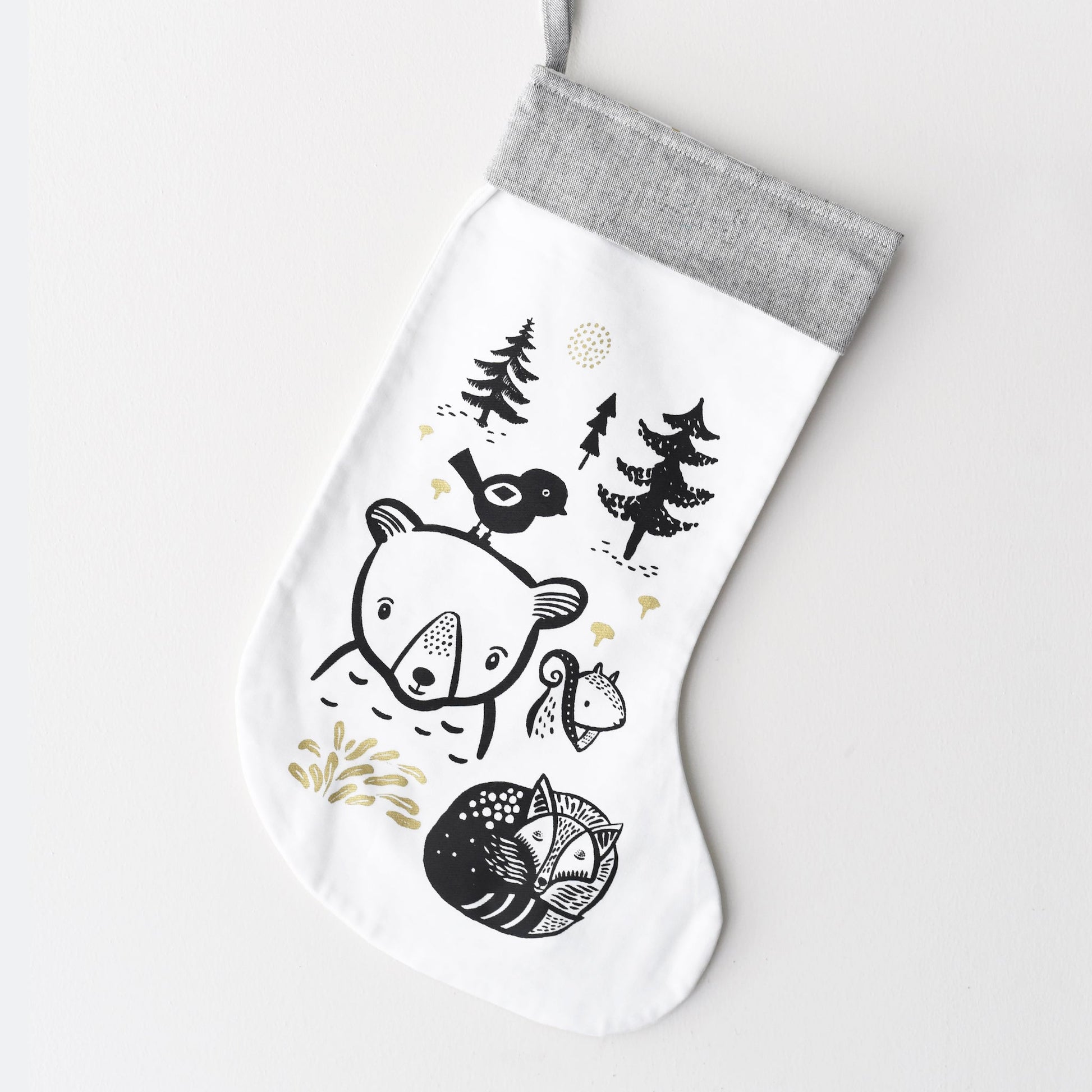 Add a touch of Wee Gallery charm to your baby's holiday season with our delightful Organic Cotton Christmas Stocking. Featuring whimsical Bear and friends printed in black on white 100% organic cotton twill, this minimalist nature-inspired stocking is adorned with gold highlights that bring a festive sparkle to your decor.