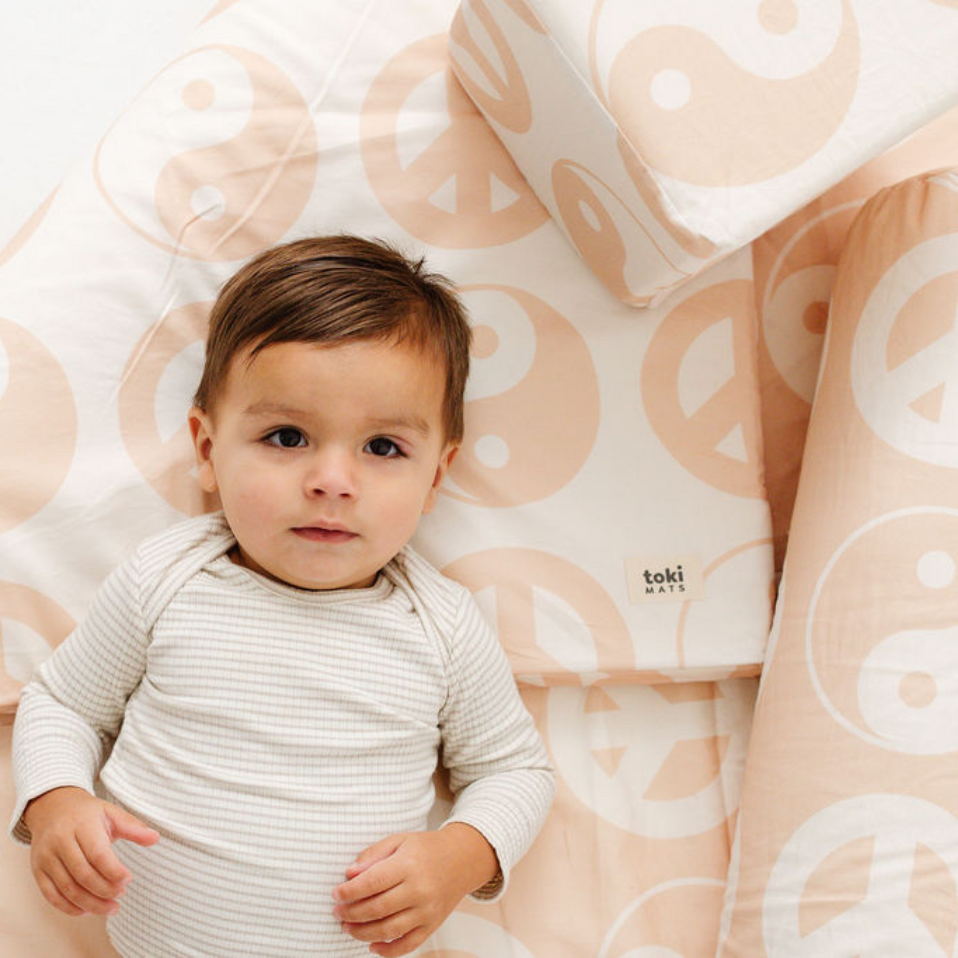 A multi-use pillow made from soft latex foam for pregnancy support, newborn feeding support, tummy time support, sitting support, and more.