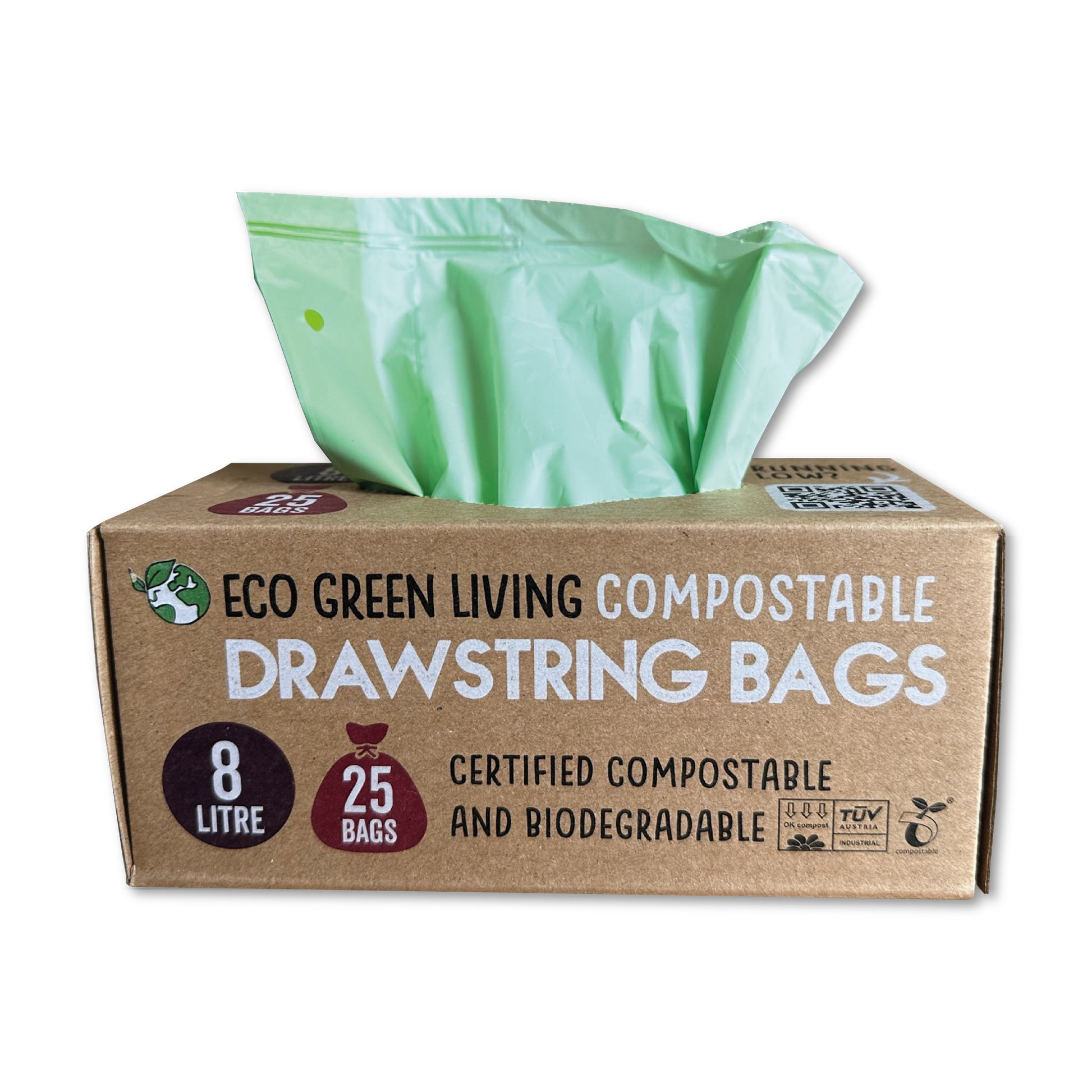 - Certified compostable — 2-gallon (8-liter) drawstring bin bags are third-party certified for industrial composting and suitable for home composting (excluding the tie).