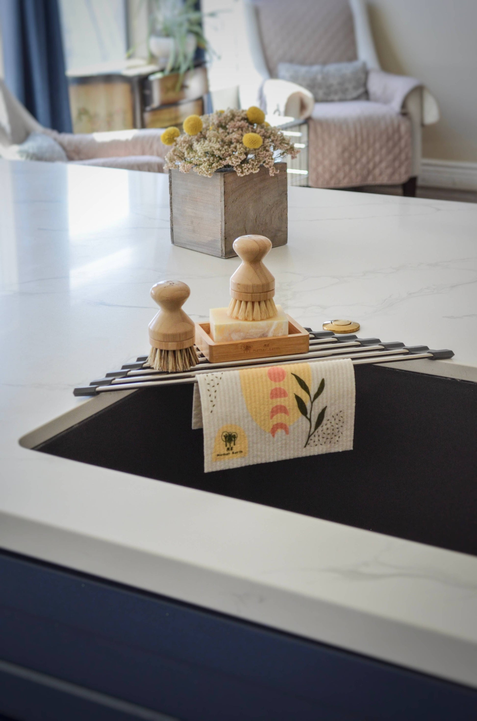 - Allows airflow and drainage to prolong the life of wood brushes, dish bars, and sponges.
