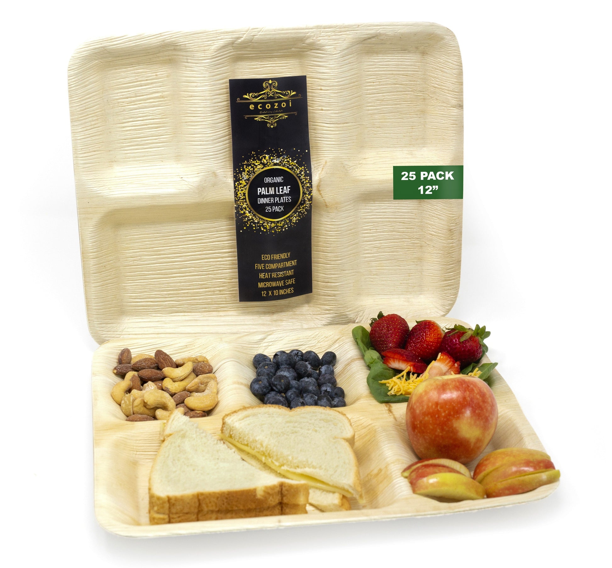 "Ecozoi Palm Leaf Disposable Plates - 100% Natural, Eco-Friendly 5-Compartment Plates for Family Meals"