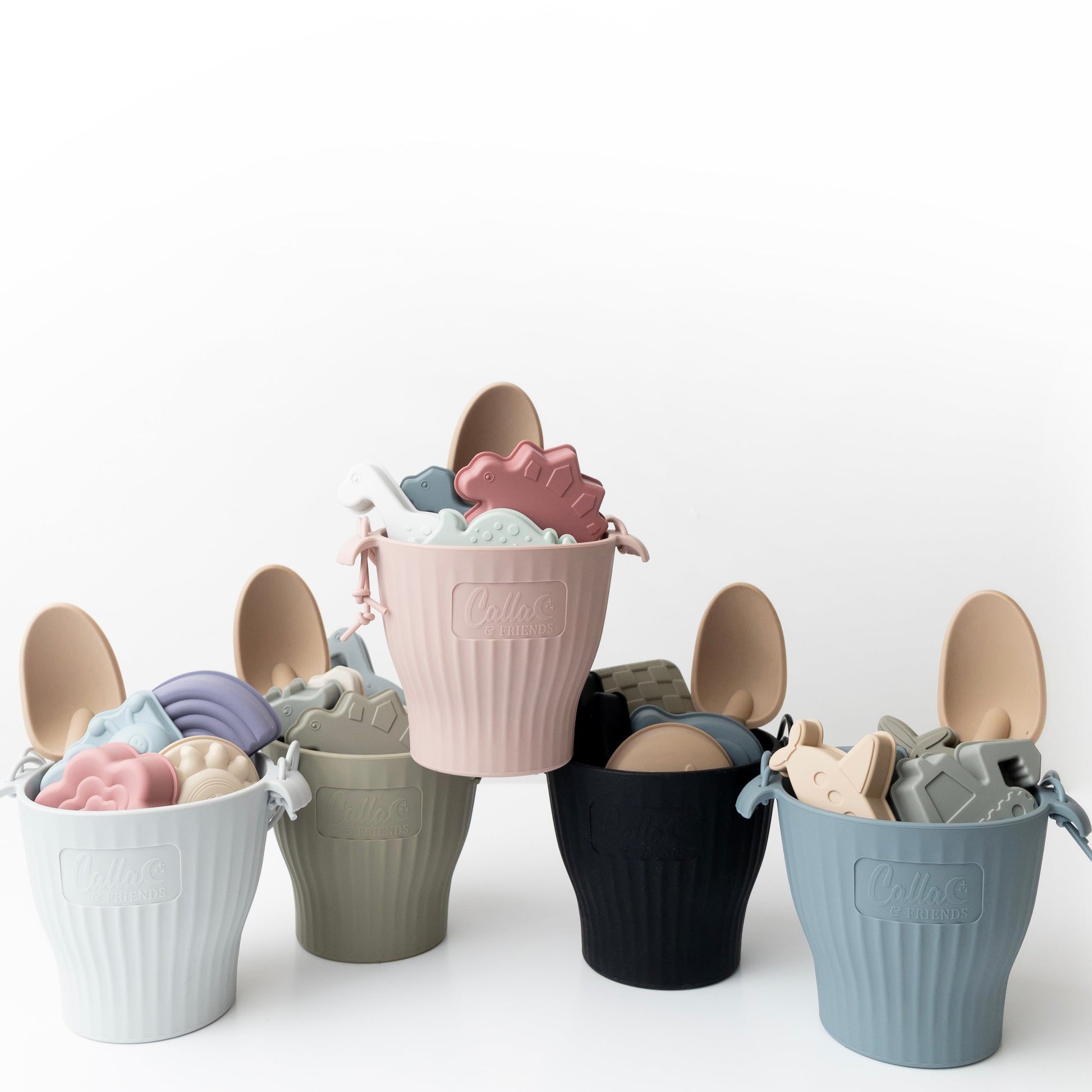 Each set includes: 1 bucket, 1 small shovel, 4 sand molds & an organic cotton storage bag