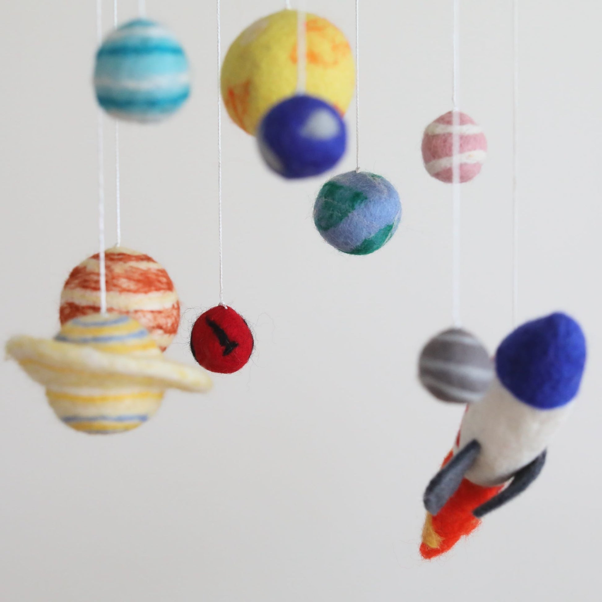 Spark your baby's imagination with our Solar System Baby Mobile. Made from soft, colorful wool, it features a collection of planets and a spaceship, creating the perfect addition to any space-themed nursery.