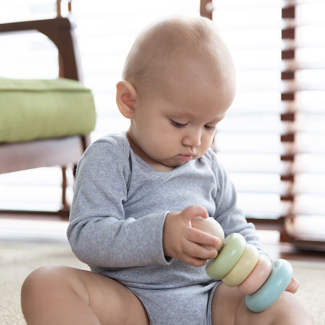 Start learning about size and order with this stacking ring. For safety precaution, the center rod is foldable.