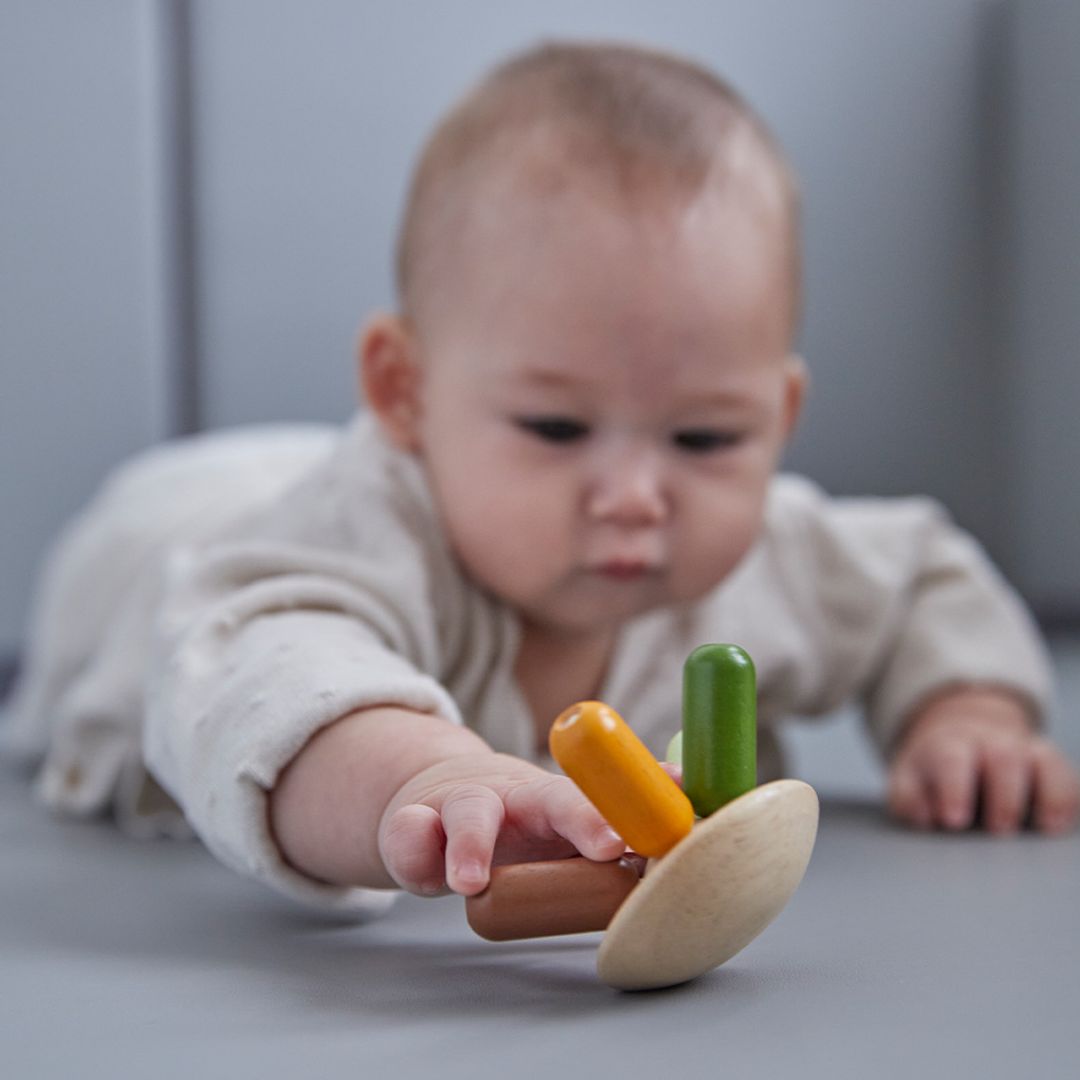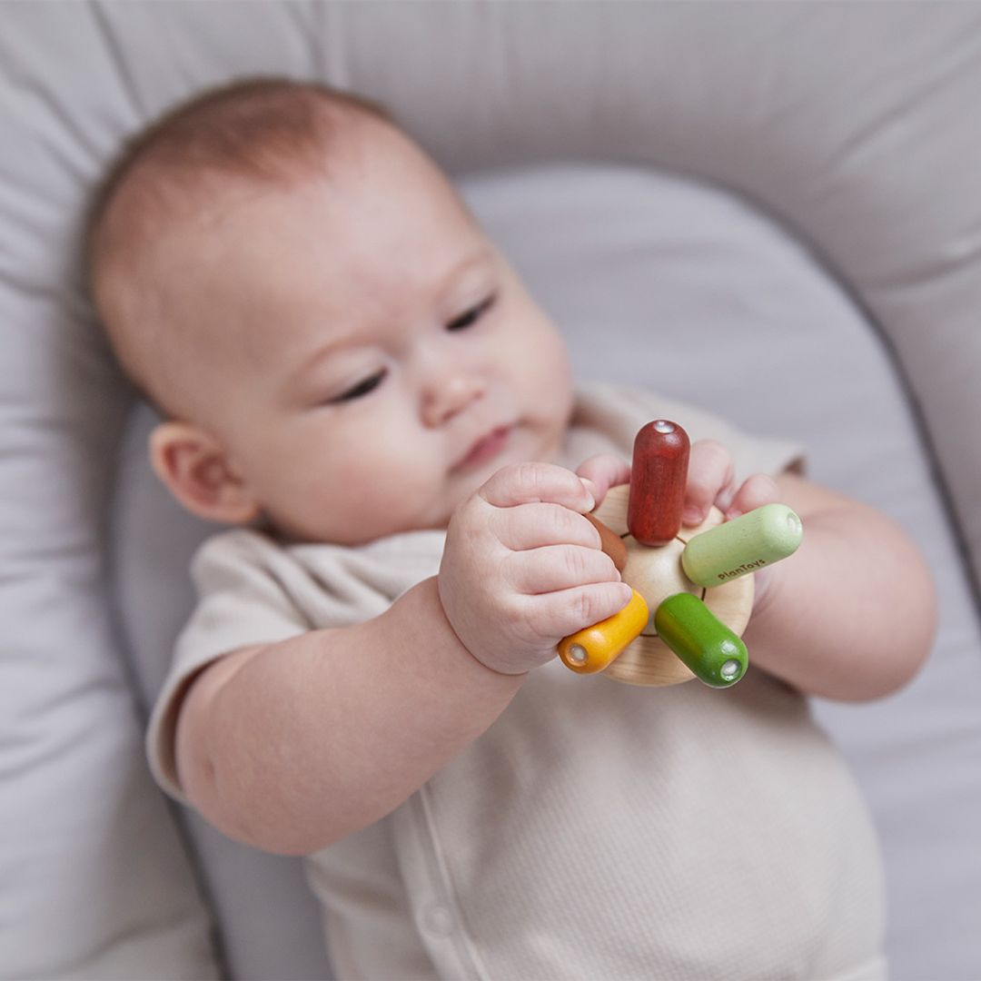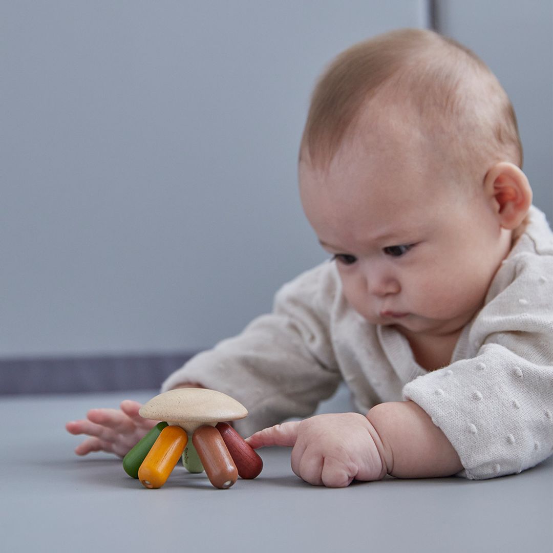 The PlanToys Flexi Jellyfish in the modern rustic colorway is a palm-clutching toy designed to fit in a child’s hand. The fun legs wiggle as they are pinched and pressed. It stimulates babies to practice grasping objects to develop capable palms and fingers. This toy will capture babies’ attention and provide a sensory and tactile experience.