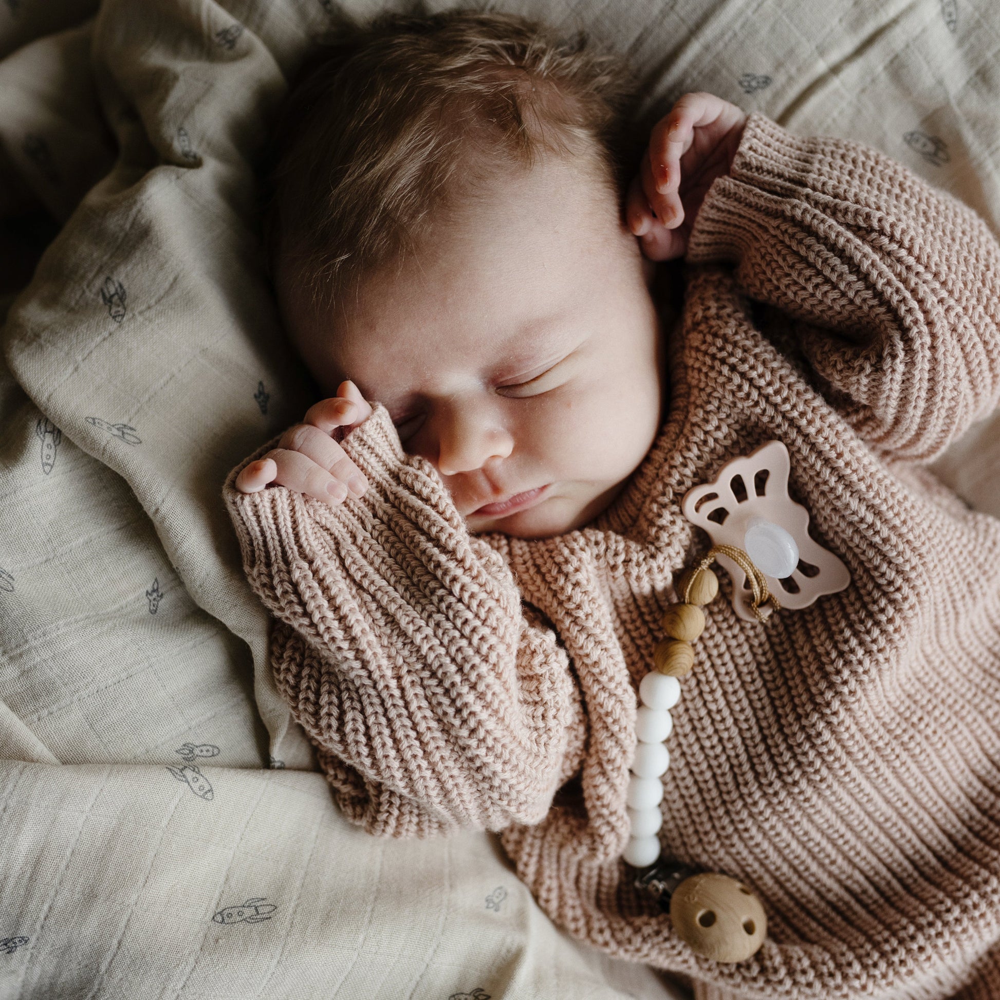 The FRIGG line of natural rubber and silicone pacifiers have been thoughtfully designed for your baby's comfort. The outward curve keeps the pacifier off their delicate skin, while features like air holes and a security handle ensure your baby stays safe. Available in a range of soft colors, FRIGG pacifiers make a beautiful addition to your collection of baby essentials.