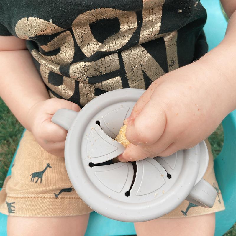 The spillproof snack lid features a special petal design with soft silicone flaps that make it easy for little hands to reach in and grab food all by themselves. Say goodbye to tricky-to-open plastic containers! What's more is that with our cup, you can shake it, throw it or tip it upside down - and your baby's snacks will stay safely inside with no mess! This makes it perfect for taking with you out and about.