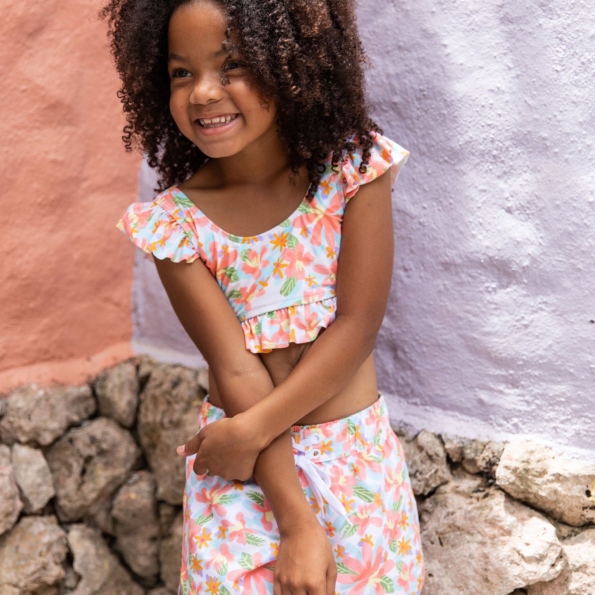 Ruffles galore for your Princess of the Seashore! Our Hawaiian Luau-inspired girls bikini is made of sustainable and breathable UPF50+ fabric in a floral pattern and doesn't skimp on the frills. Tug on the two-piece and channel her inner Moana, setting off in search of shells and sea creatures.
