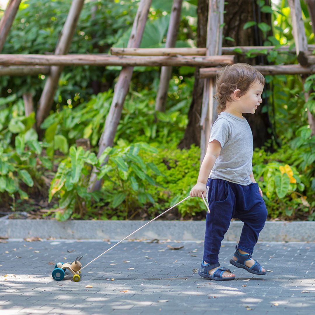 - Encourages newly-mobile children to continue walking and building physical strength as the rabbit moves alongside them