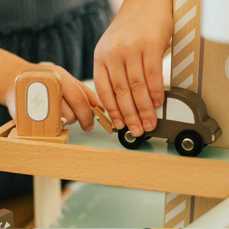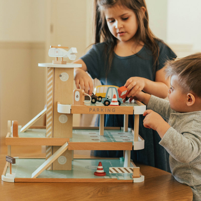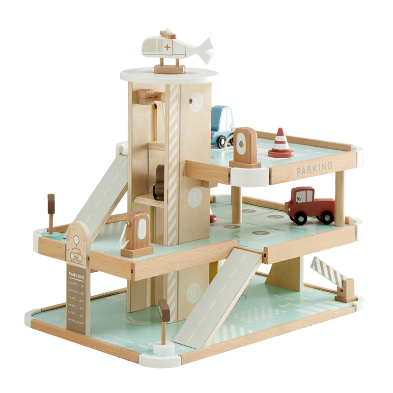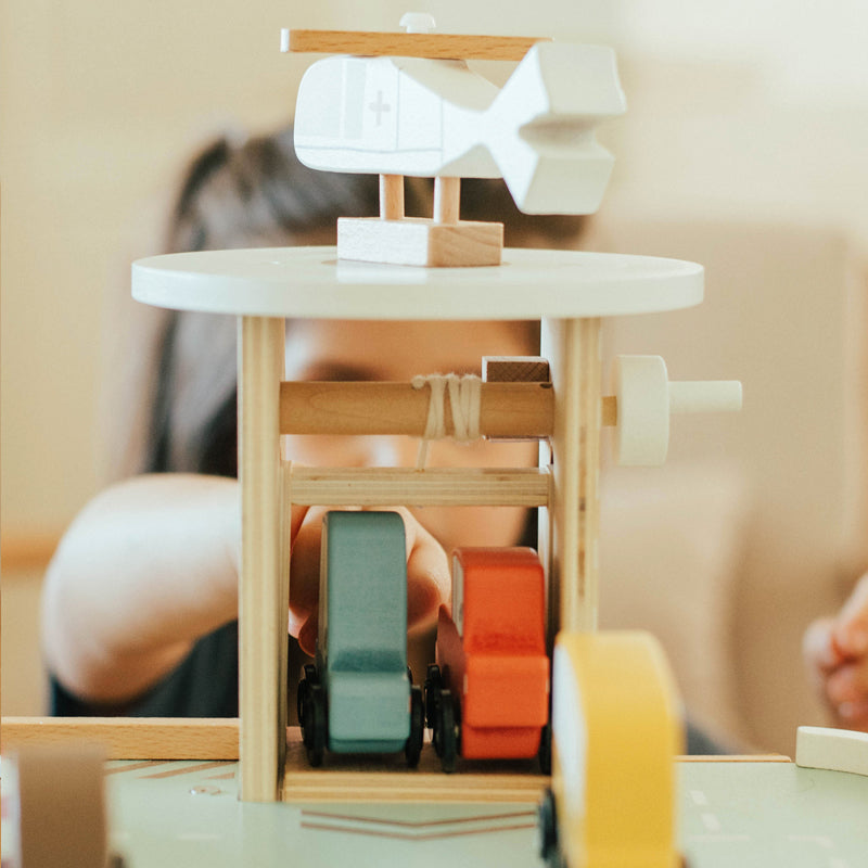 Your little tot will drive into fun with our Little Tot Parking Lot. Our quality wooden parking lot has 3 floors of imaginary play including ramps, helipad and helicopter, 3-floor crank elevator, 4 motor vehicles, safety cones, signs, gas pump and charging station, and more! Simple assembly, and you're ready to go. Now park it!
