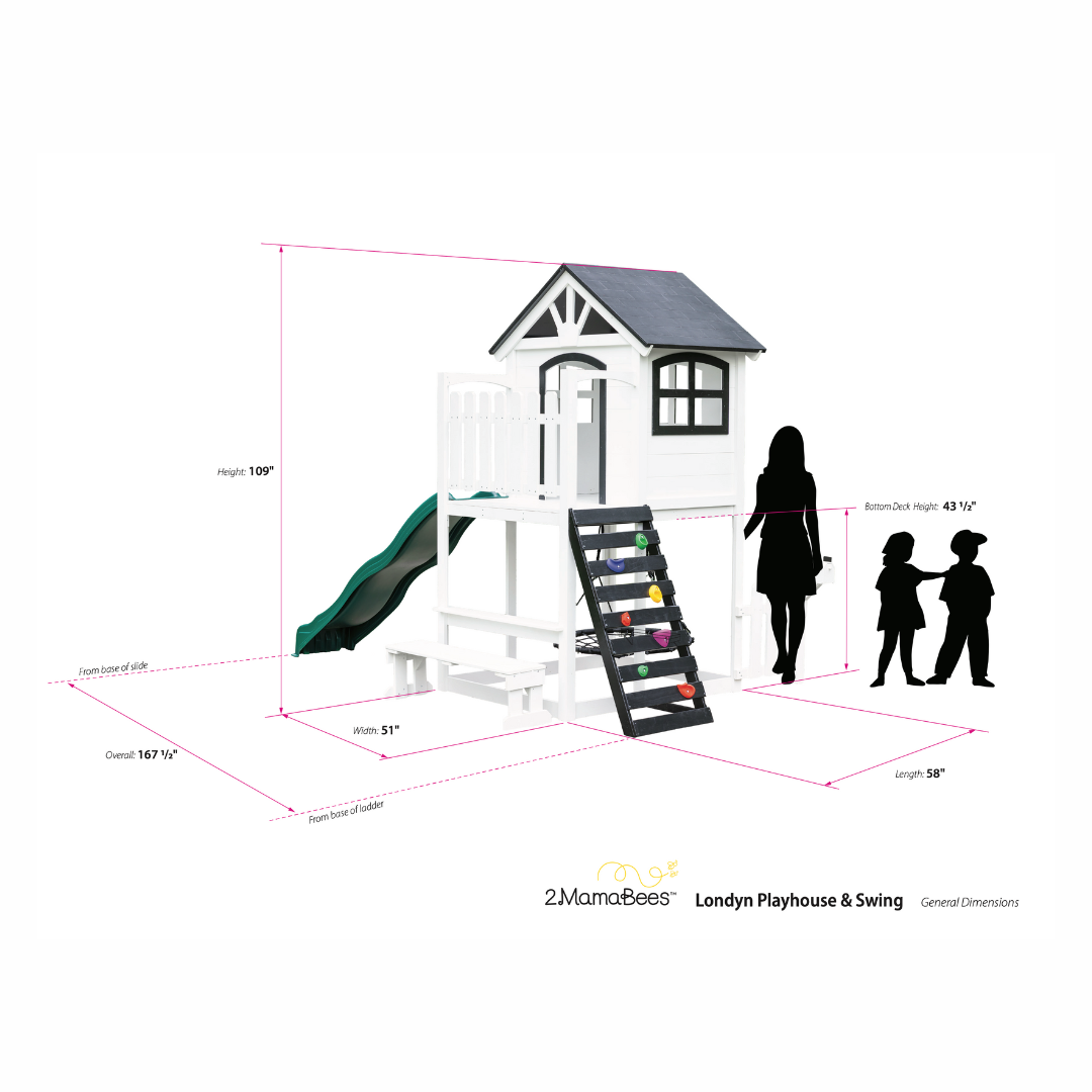 Introducing the 2mamabees Londyn Swing Set in Custom Color—where personalized style meets endless outdoor adventure! This exceptional play system combines the comprehensive functionality of the beloved Londyn design with the freedom to customize colors that perfectly complement your backyard aesthetic and family preferences. Featuring a spacious nest swing, challenging rock climbing wall, complete built-in kitchen, and thrilling slide, this impressive structure can now be tailored to match your unique vision while maintaining the sophisticated farmhouse-inspired design that makes 2mamabees products so distinctive.