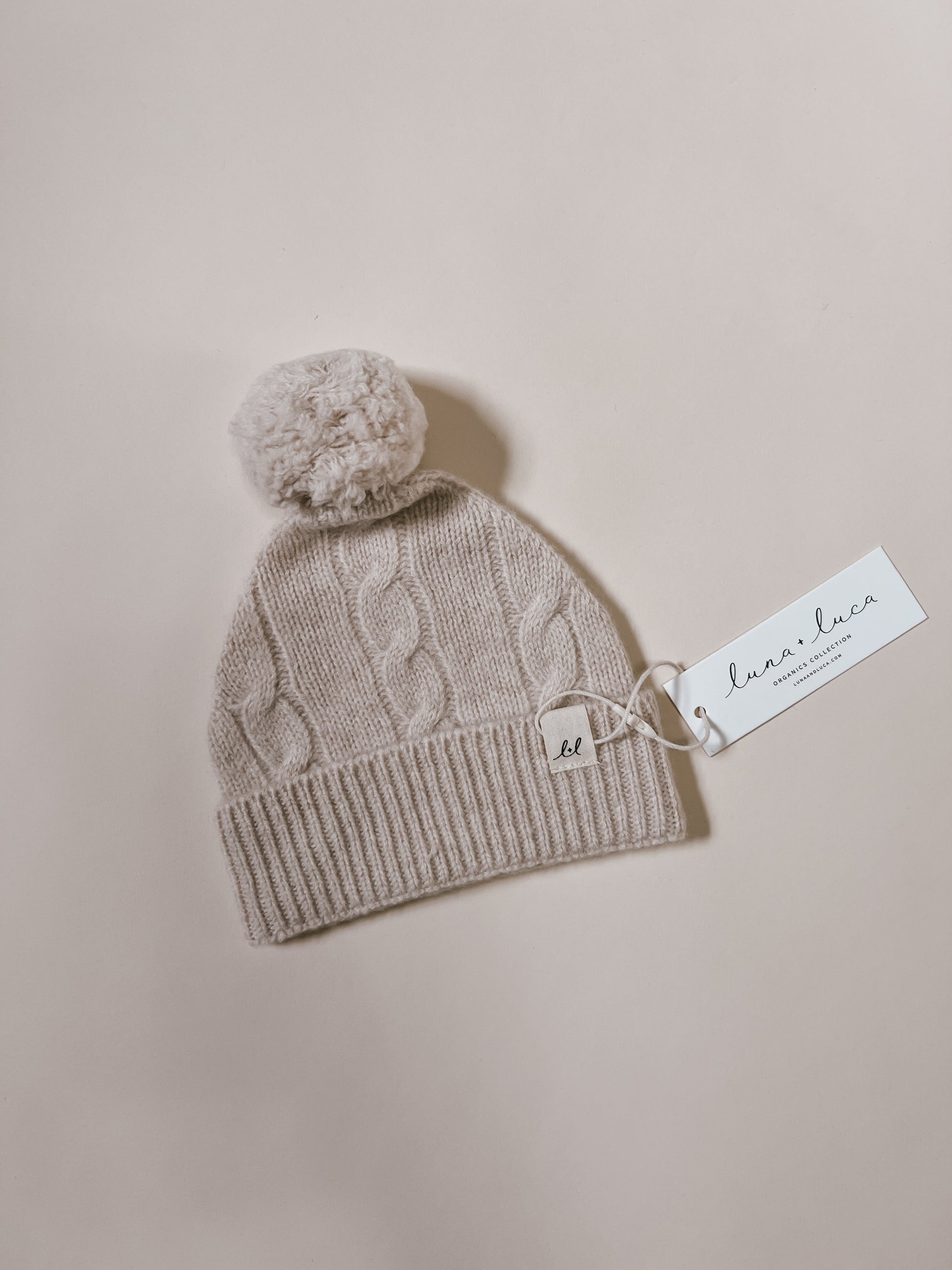 Luna + Luca Merino Wool Cable Knit Pom Baby Beanie - Sand
