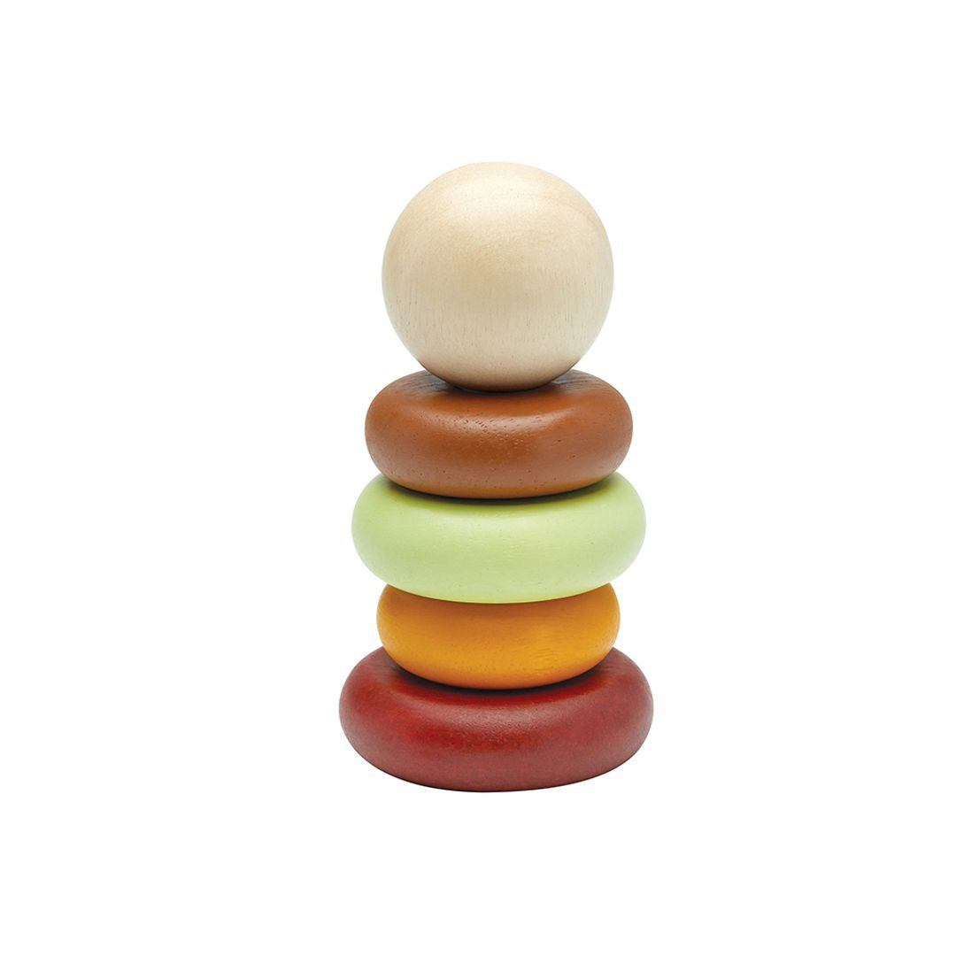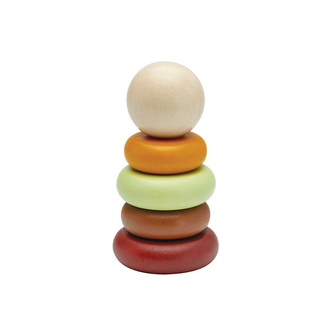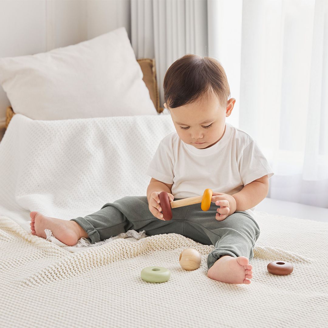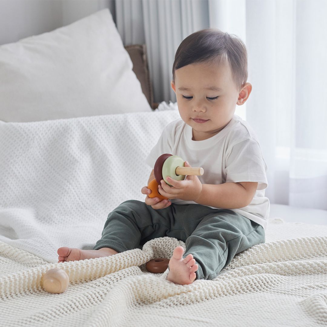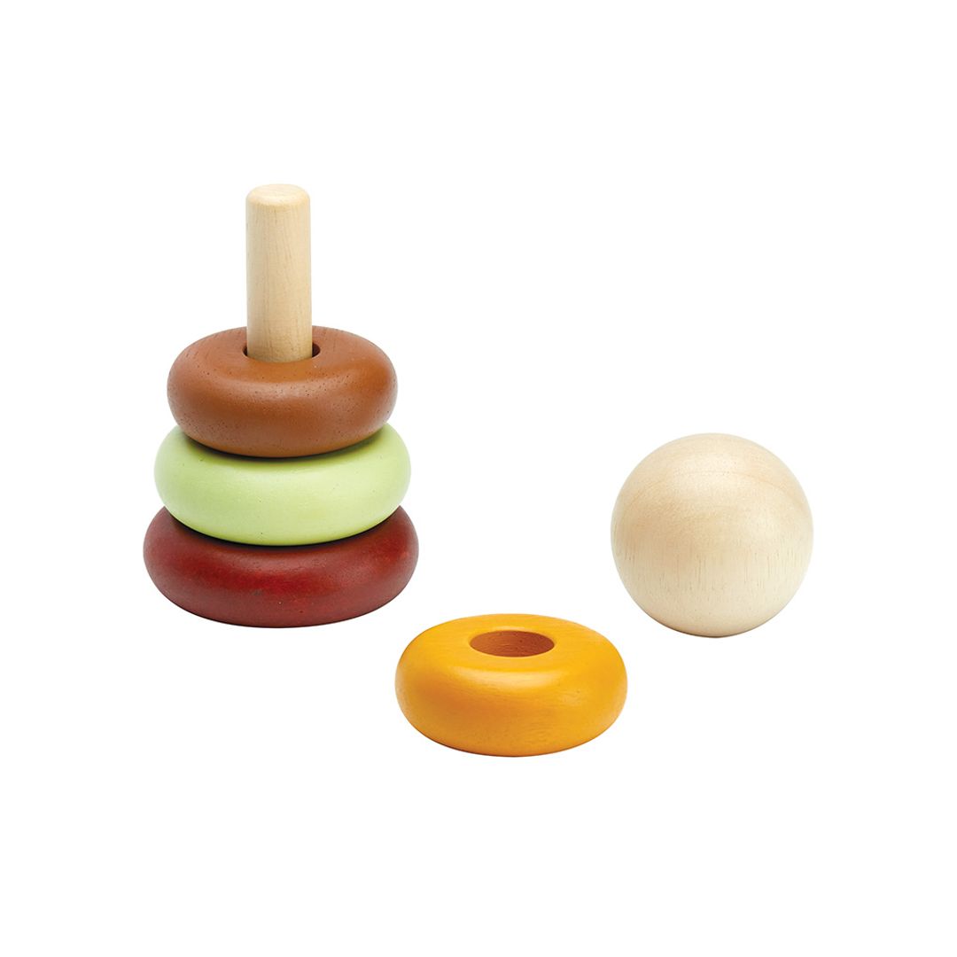 Start learning about size and order with the PlanToys First Stacking Ring. This version comes in our modern rustic colorway. Children will be able to stack the rings over and over again in the pattern of their choice as they develop foundational fine motor skill through play. For your child's safety and storage purposes, the center rod is foldable.