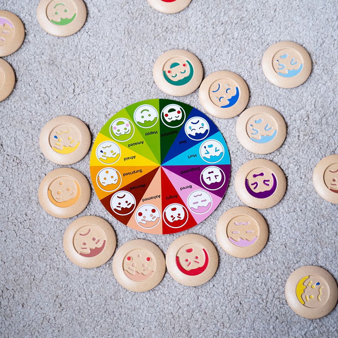 The set consists of 24 wooden tiles with 12 different emotions. Children can learn how to match two identical emotions with this fun memory game! Skills include learning about the relationship of colors and emotions. Emotion Color Wheel can help visually group feeling and practice emotion vocabulary.