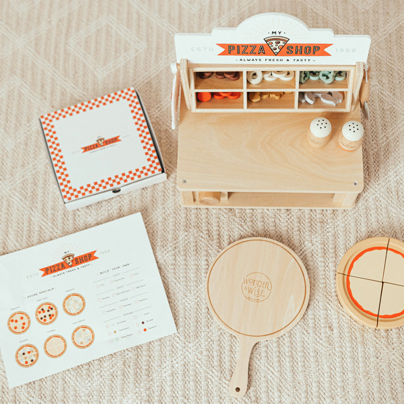 Did someone say PIZZA!! Delivery or make it yourself, there is no better pretend pizza than My Pizza Oven Play Set! Our wooden pizza set comes complete with wooden handled board, full pizza oven with a knob and holders for all the toppings including pepperoni, onions, sausage, anchovies, green peppers and mushrooms, cheese and red pepper shakers, pizza slicer, potholder, menu, and cardboard pizza box. Nestle the toppings on the 4 pre-sliced pieces of pizza and have yourself a pizza party! Order up!!