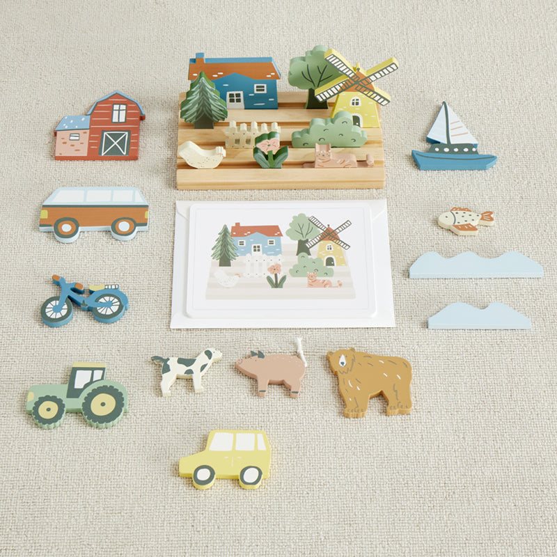 Our My Town Picture Matching Game is a great and fun way to help your kiddos learn placement and sequencing by matching the wooden objects to the pictures. Our high-quality set includes a chunky wooden base that holds 21 assorted vehicles, trees, houses, bikes and more. 12 cardboard pictures with scenes to match. Learning has never been so much fun!