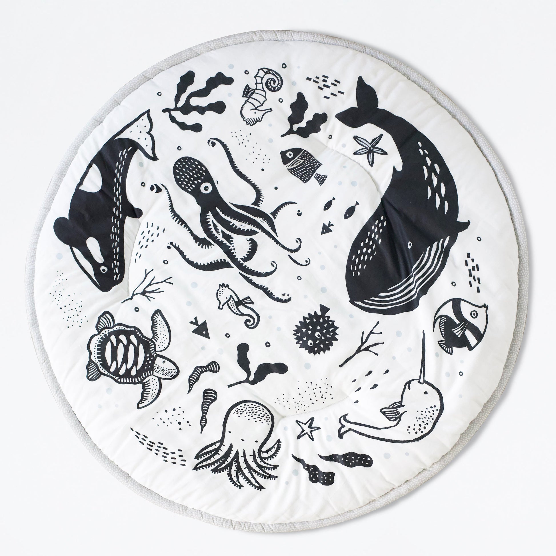 This reversible playmat features hand-illustrated ocean animals on one side and a lovely neutral pattern on the other. Made in India using organic traditional fabrics, it's the perfect setting for your baby's playtime and development.