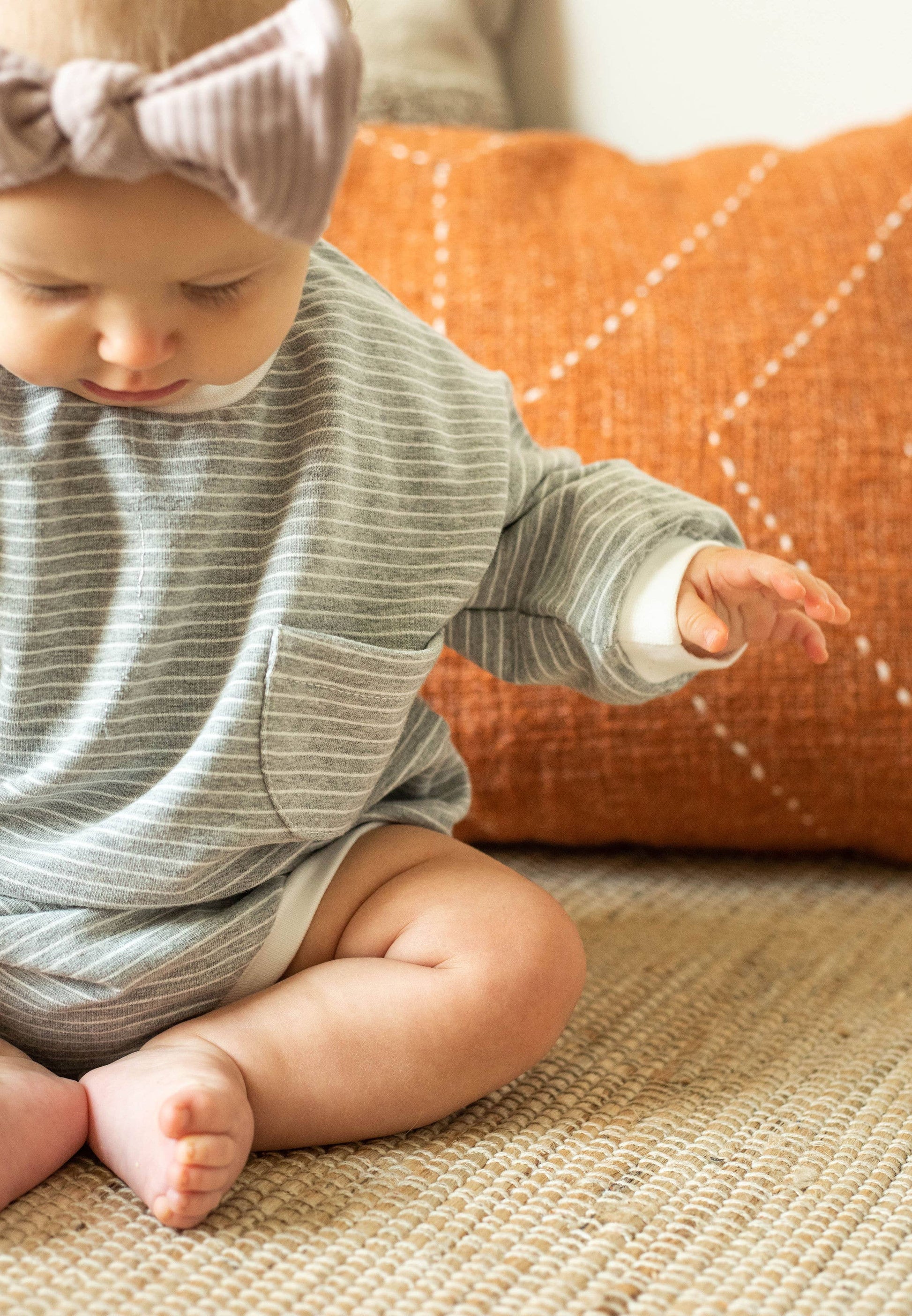 Featuring longer sleeves, a higher neckline, and easy-access bottom snaps, it ensures your little one stays cozy while making diaper changes quick and simple. The casual yet stylish design makes it perfect for everyday wear or as a thoughtful baby shower gift.