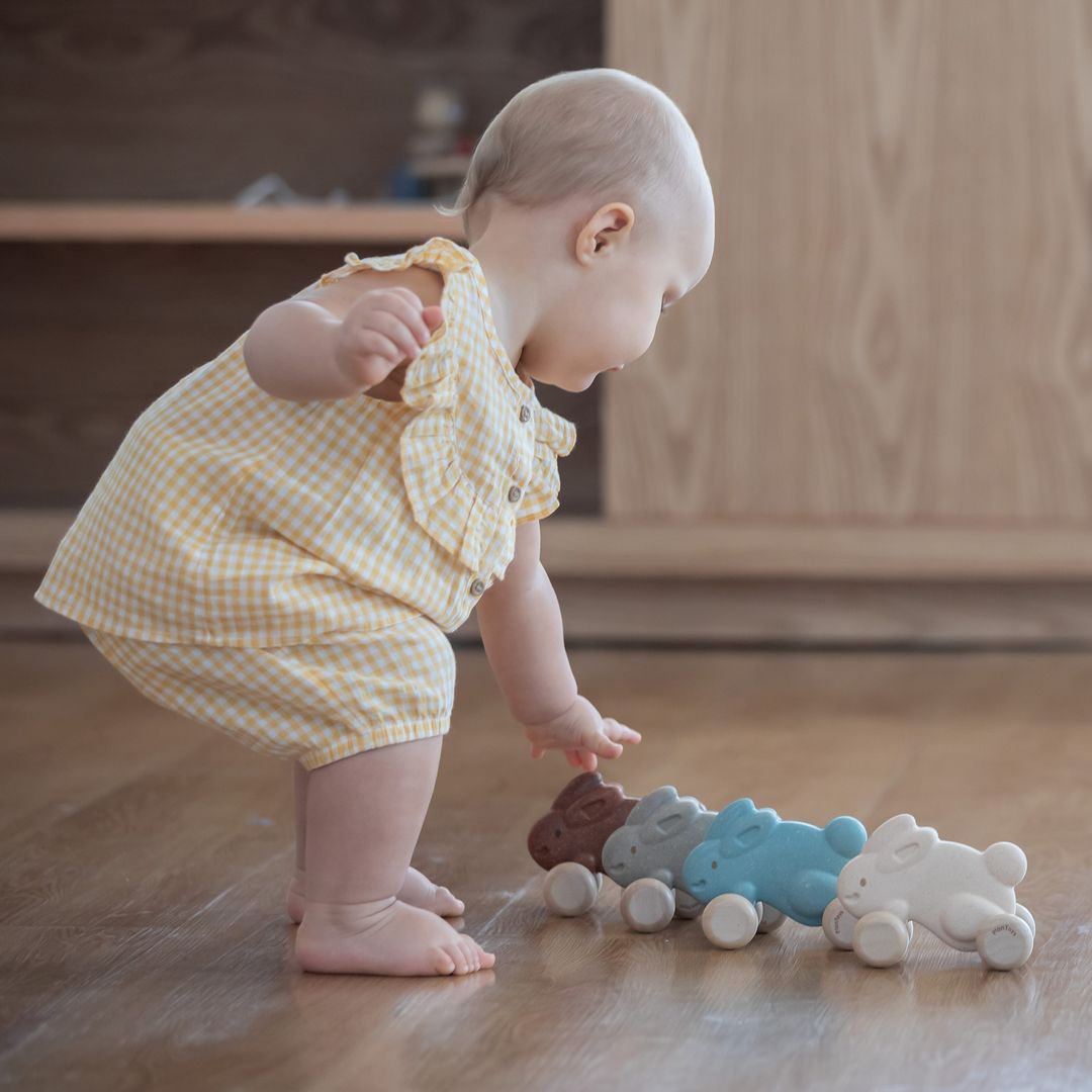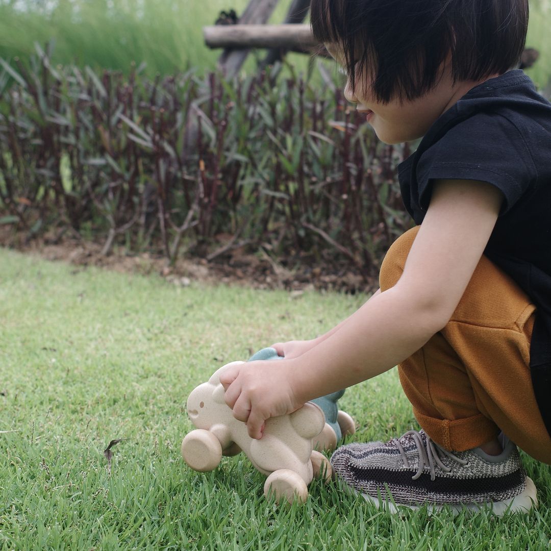 Hop alongside this happy bunny! With a soft touch and an energetic design, children can easily grab and play with these push-along bunnies and incorporate them into imaginative play scenarios. Through play, kids also develop fine motor skills and gain exposure to cause-and-effect relationship.