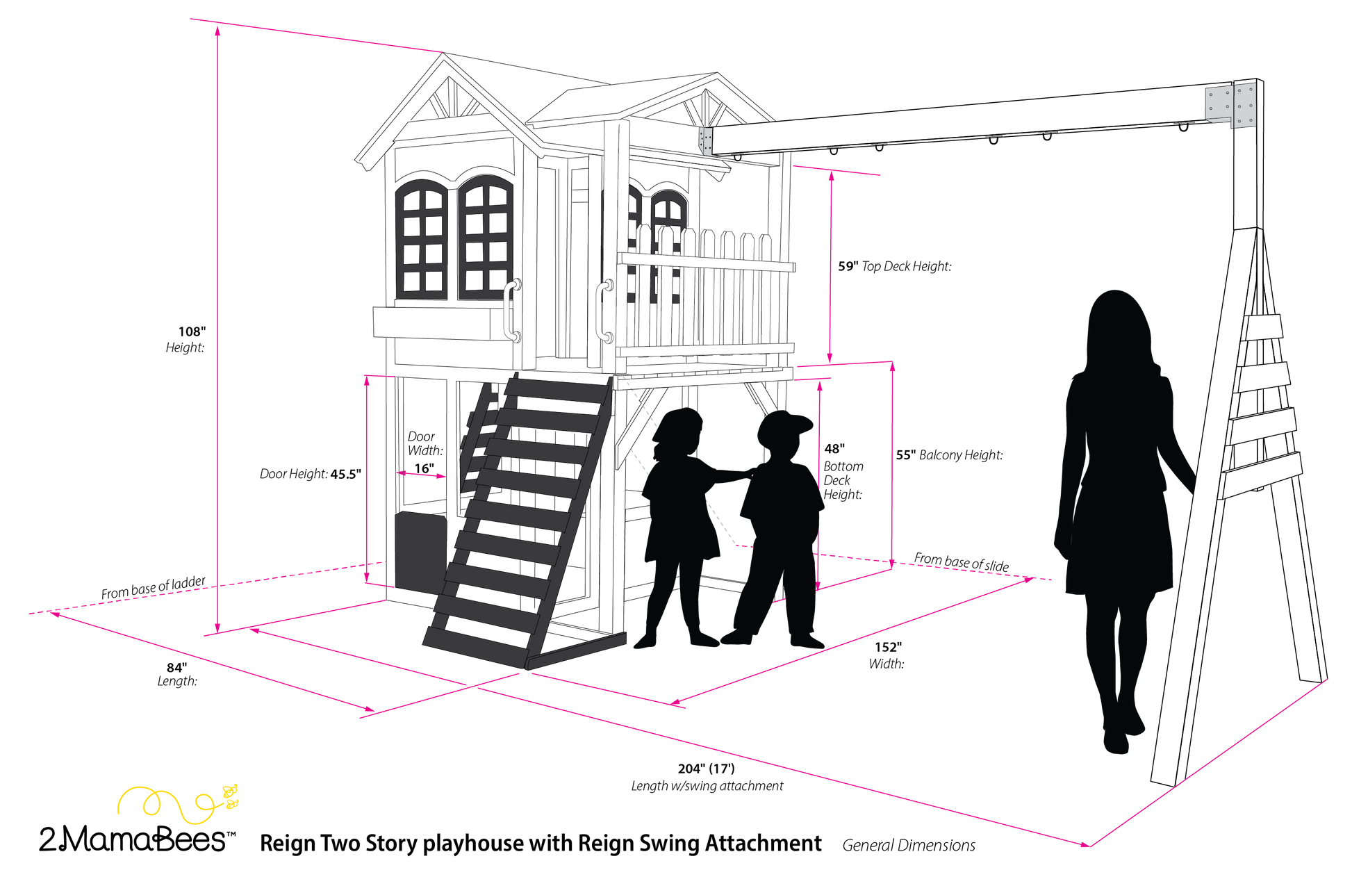 Your 2mamabees Reign Two Story Playhouse is designed for minimal maintenance and maximum outdoor durability. The premium white pine construction and weather-resistant low VOC finishes provide natural protection against outdoor elements while maintaining beautiful appearance through seasons of active play.