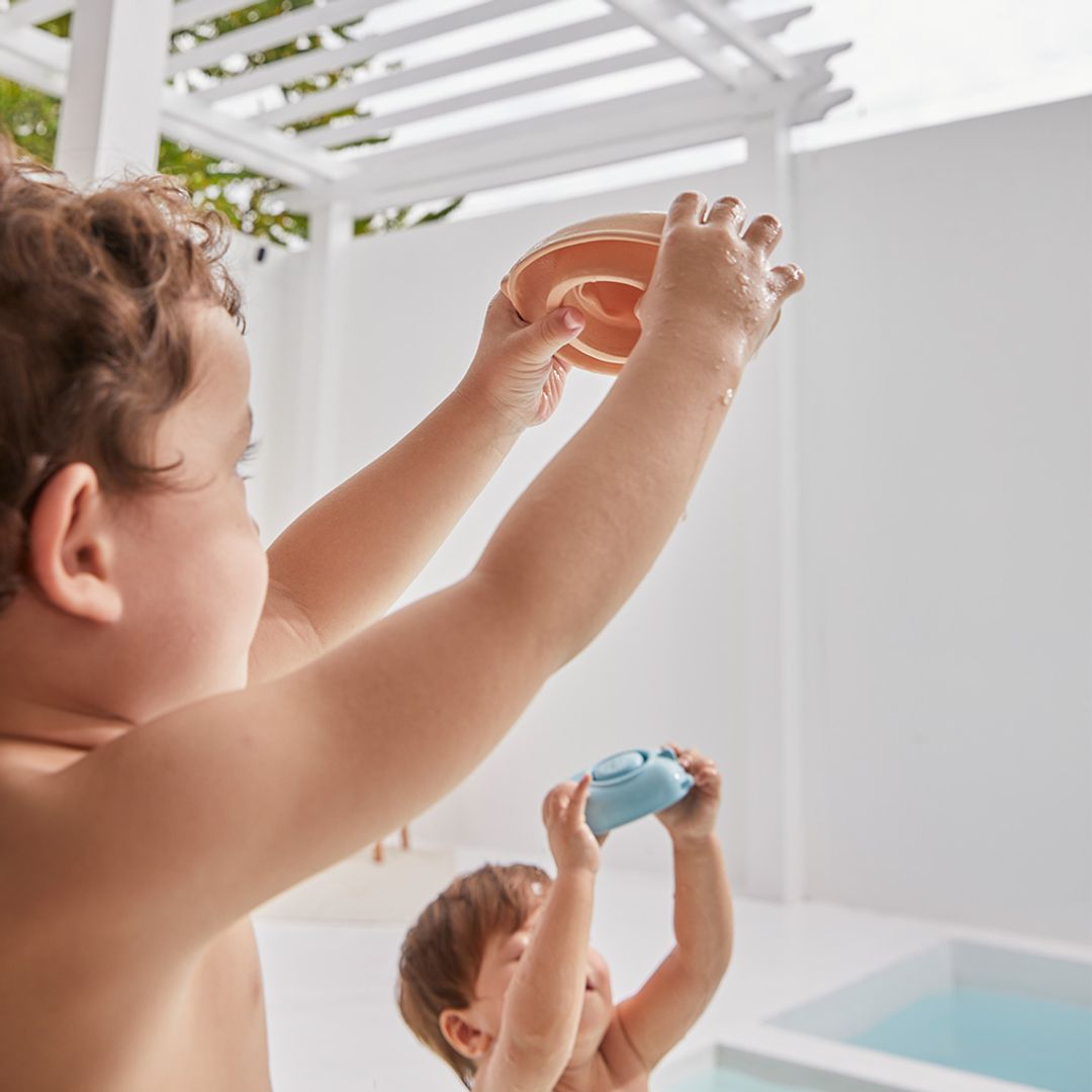 It's a rubber boat that explores both the surface and the underwater depths! By Simply pressing the center of the hull and turning it over, the boat becomes a submarine. This makes for an extra unique play experience during bath time and water play. Challenge your child's creative thinking skills and stimulate their imagination while inviting them to explore their fine motor development with this water toy.
