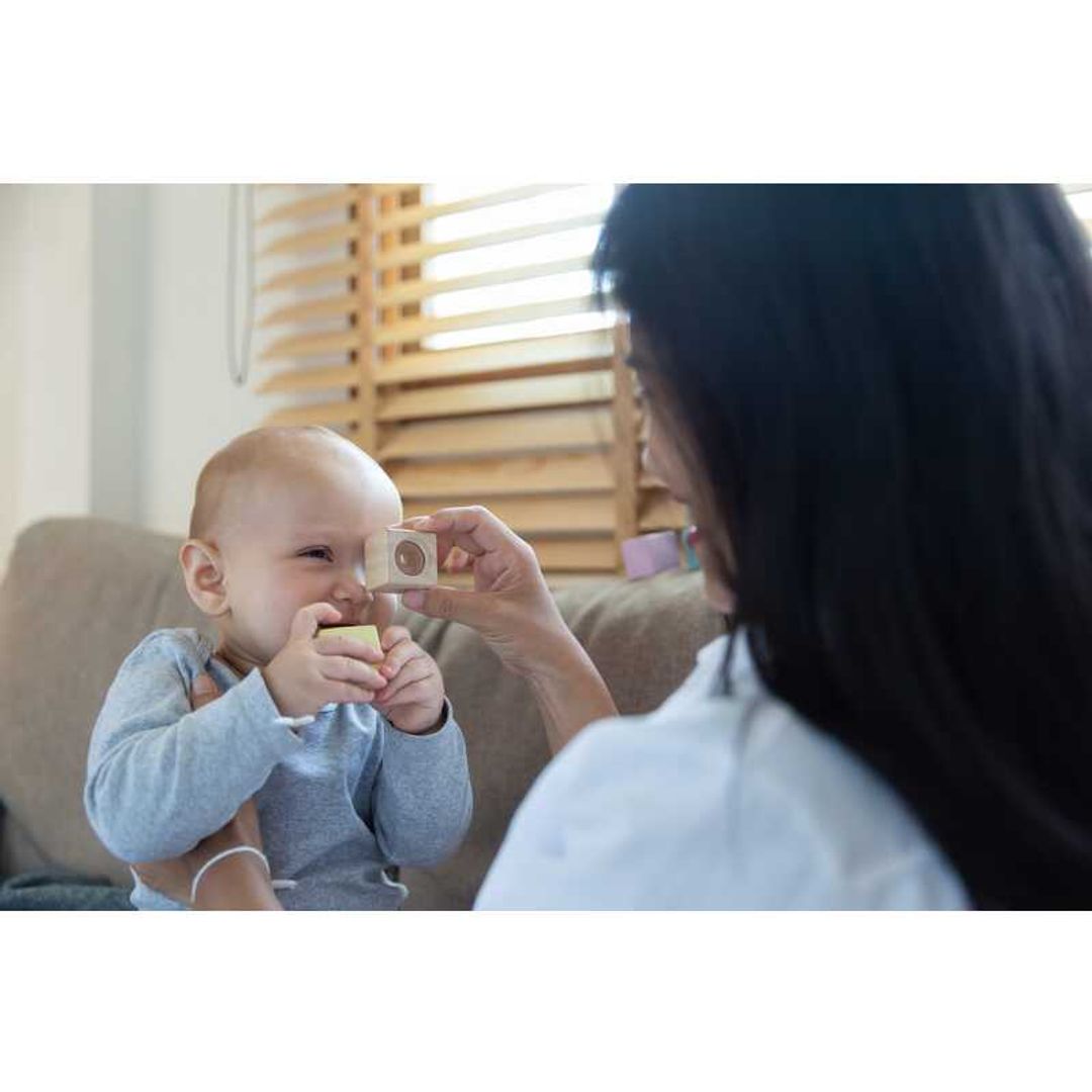 This set of 6 sensory blocks consists of 2 visual, 2 auditory and 2 tactile blocks. This toy stimulates touch, sight and sound while encouraging kinesthetic learning