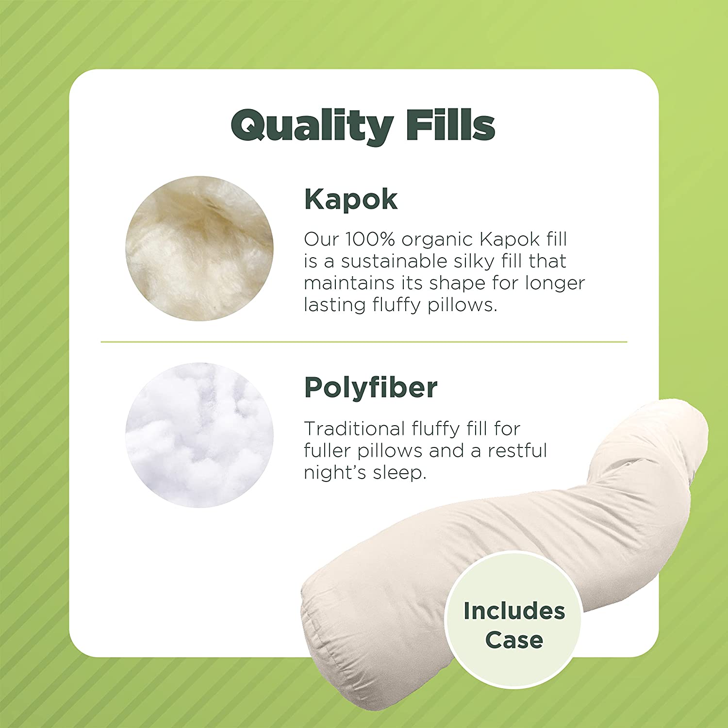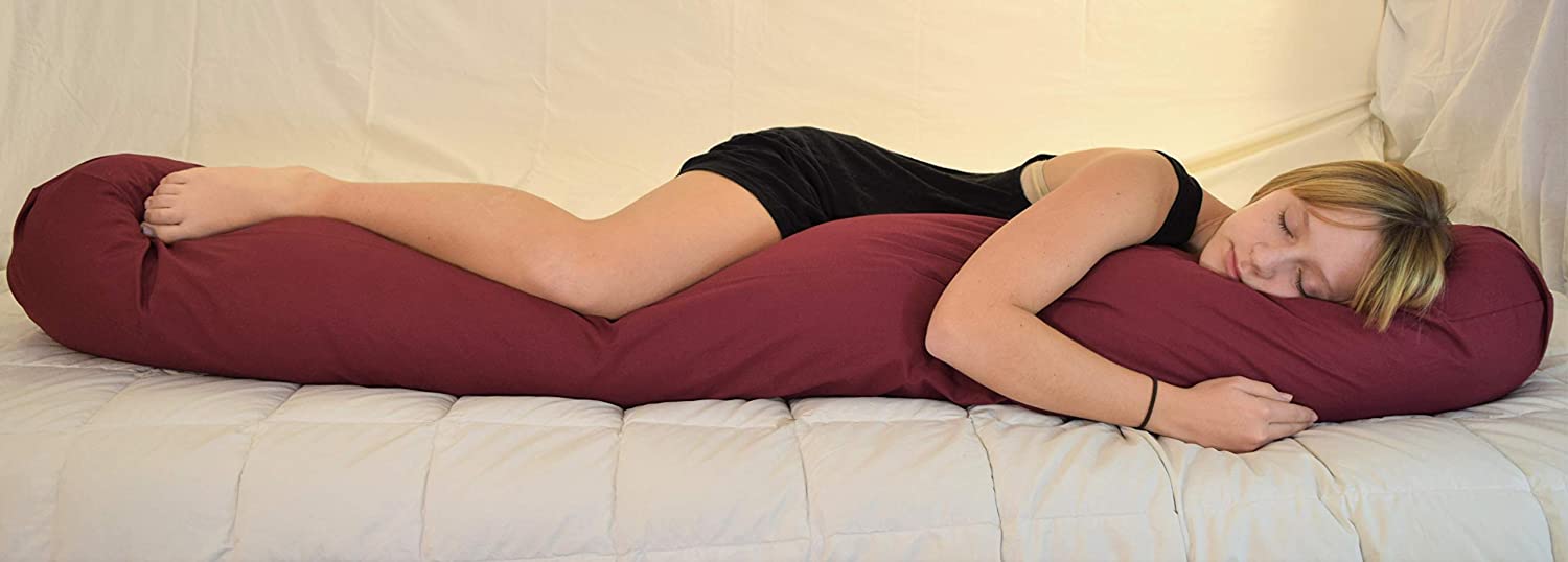 The Sleeping Bean Body Pillow is a long body pillow for adults and teens. Its cylindrical shape supports the human body in natural sleep positions. This sleeping body pillow reduces tossing and turning through the night. It helps align your spine and eases muscle stress. Choose from hypoallergenic polyfill, organic kapok, or medical-grade fill. The pillow body case is soft, washable, and built to last. Both the adult body pillow and teen pillow sizes give reliable comfort.