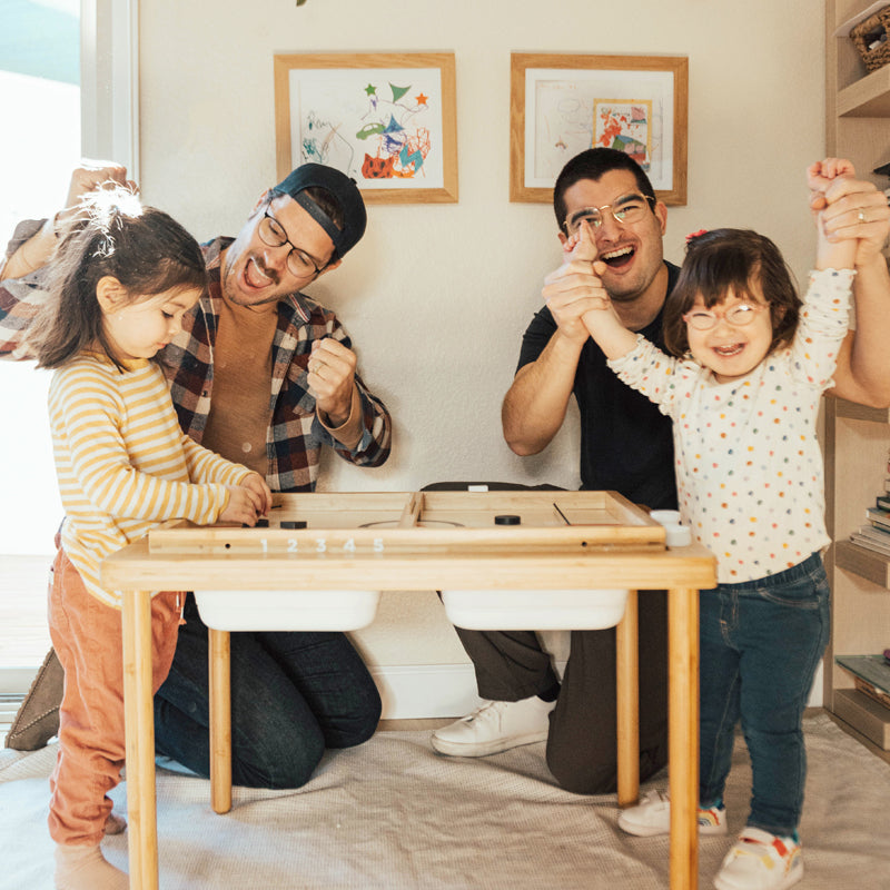 Get your competition on with our Sling-a-Ling Table Hockey Game. Play on any table, on the floor, or slip it right into our Land, Sand and Water Table for a perfect gaming experience. Comes with 6 black and 6 white pucks, 2 different center gates to increase or decrease difficulty level, and 2 scorekeepers. Pull back the elastic behind your puck and let it rip! No batteries or controllers needed. Works on KID POWER! Don't be a ding-a-ling...be a Sling-a-Ling!!