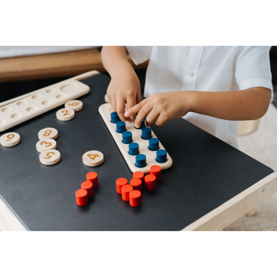 Do you know what 10 + 7 is? What about 5 + 6? The PlanToys Ten Frame set helps children develop their understanding of basic addition, subtraction, and multiplication with numbers 1-20. Match the number of pegs on the playing boards to the numbers shown at the base. Play instructions are included in the packaging. Compatible with other block sets in the Unit Plus series.