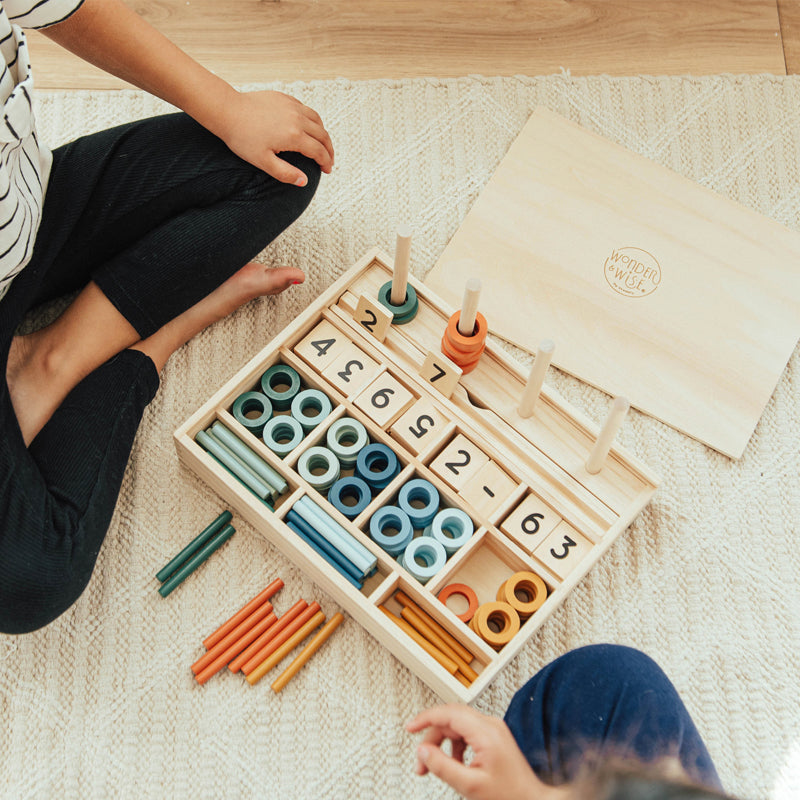 The Math Path has never been so easily paved, and is so much fun, kids won't even know they're learning! Our set comes loaded with 43 tiles that include numbers and equation signs, 44 color counting sticks, 64 color counting rings, a removable equation tray, and 4 ring stacking pegs. They all fit inside of our wooden storage box that closes with a sliding cover. From the very young to older children, The Math Path helps teach equations, counting, color matching, and more. Get on the right path!