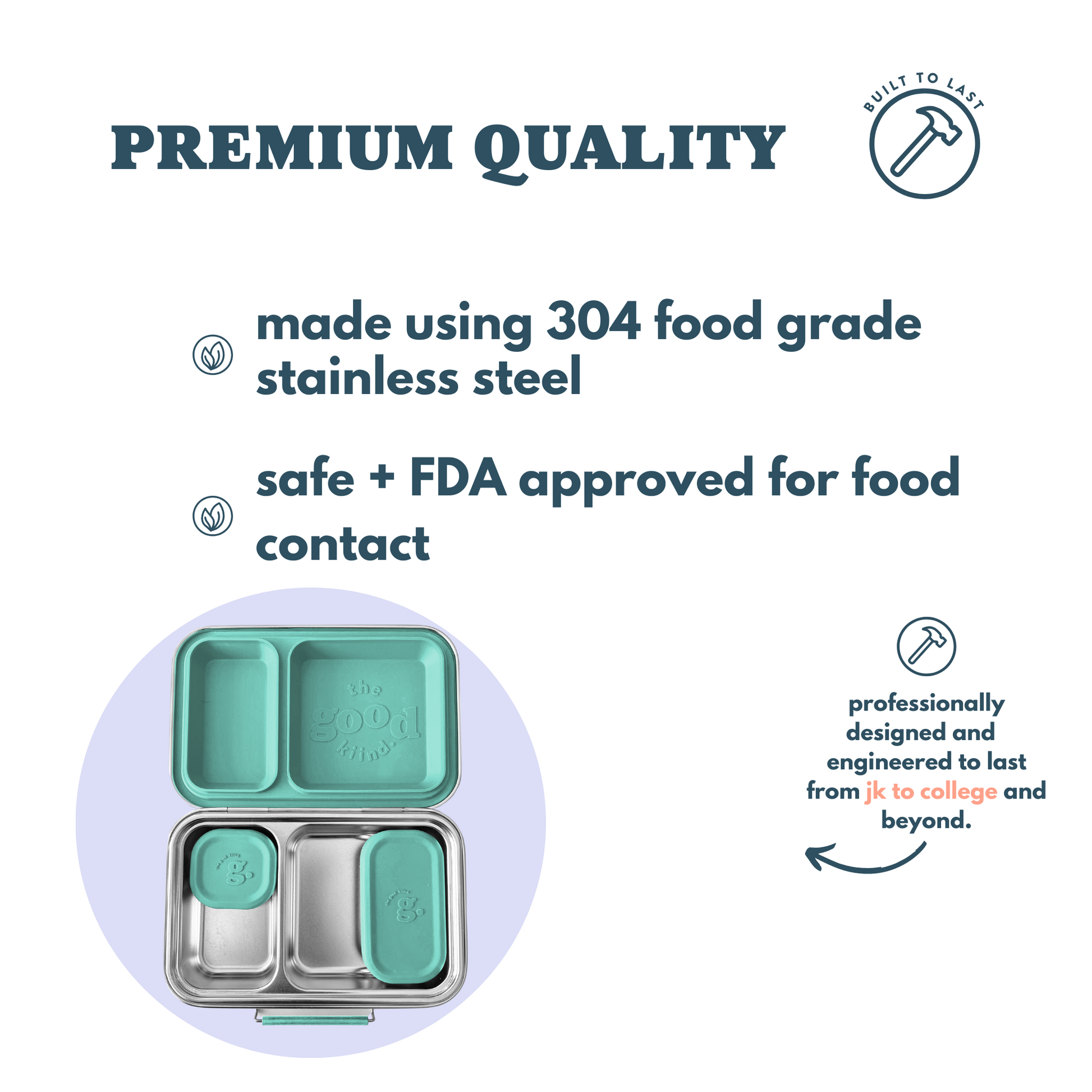 The Snacker™ lunch box is our most versatile container yet! Robust and durable, this stainless steel, eco-friendly lunch box is built to withstand rough rides inside a backpack – while keeping your precious midday meal fresh and undamaged. Thanks to handy mix and match compartments, you can use this container as a 2- 3- or 4-compartment lunch box depending on your needs that day!
