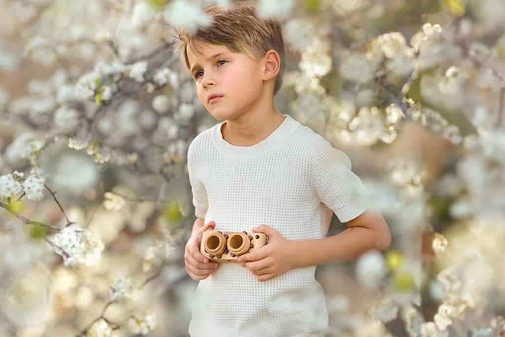 Beautifully crafted from solid walnut and breech, the Twinkle Wooden Toy Camera is more than a toy—it is an heirloom made to last for generations. With twin kaleidoscope lenses, a clickable shutter, and turning wheels, it brings pretend play to life while encouraging creativity and storytelling. Designed with love from parents, this eco friendly toy also doubles as interior decor, adding warmth and style to your home long after playtime ends. Available in multiple finishes with optional flashlight add ons.