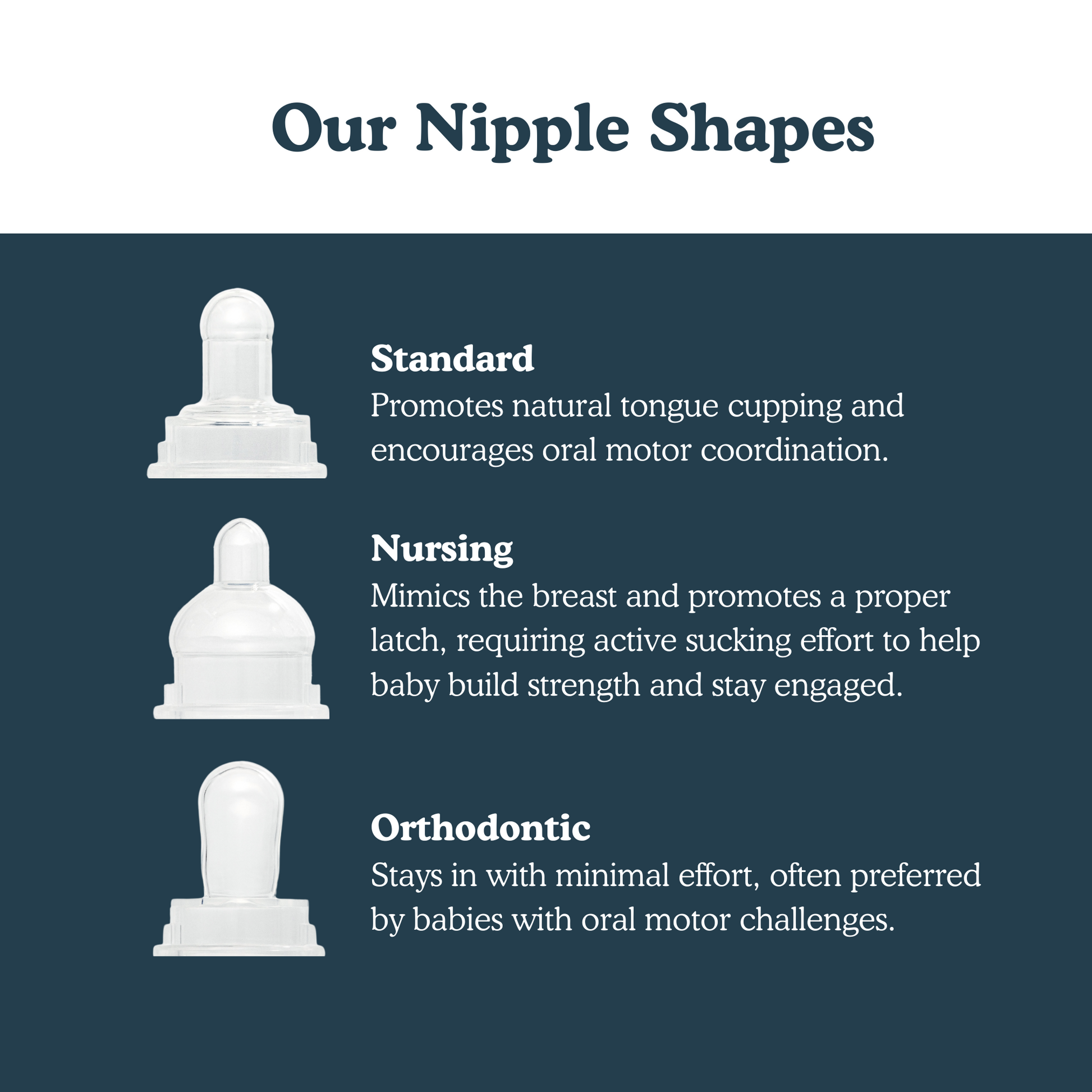 Nipple Options: Nursing, Standard, Orthodontic shapes