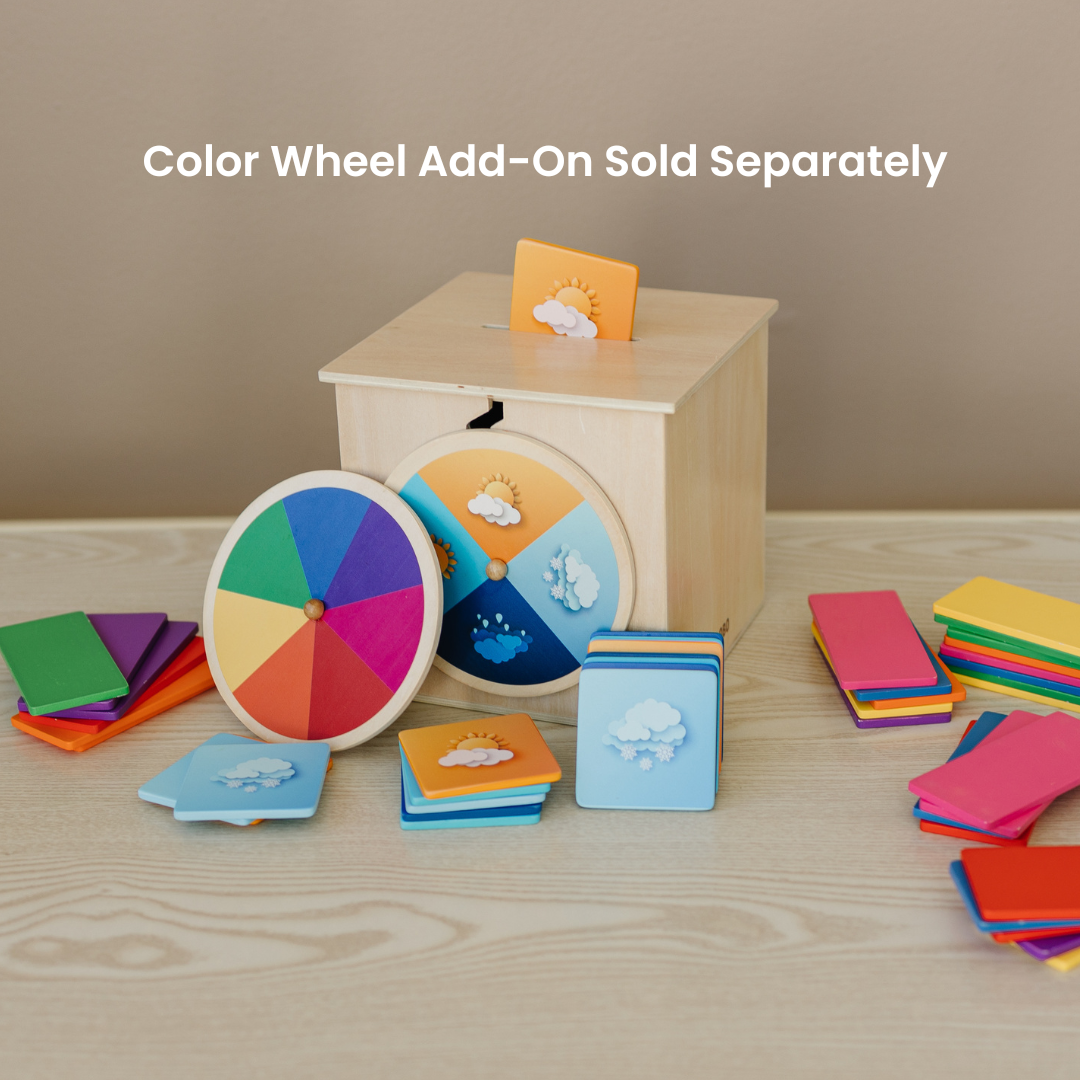 Included: Weather wheel, 20 weather pieces, and a wooden box for storage (Color Wheel Add-On Sold Separately)