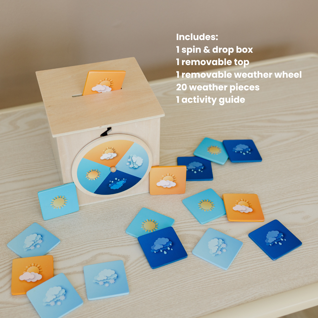 The Weather Spin & Drop is a Montessori-inspired educational toy designed to make learning about the weather fun and interactive. With its FSC-certified wooden box, removable top, vibrant weather wheel, and 20 weather pieces, this toy promotes both cognitive development and fine motor skills while fostering creativity and imagination.
