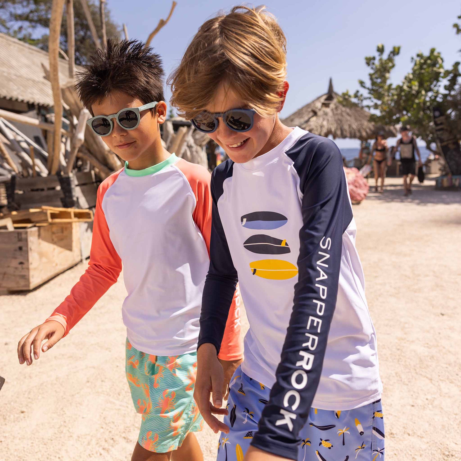 Enjoy sunny days without worrying about sunburn wearing this rash guard swim top, featuring neon coral sleeves and a mint collar set against a crisp white body. Made from sustainable, chlorine-resistant fabric, it provides comfort and UPF protection for long hours in the water.