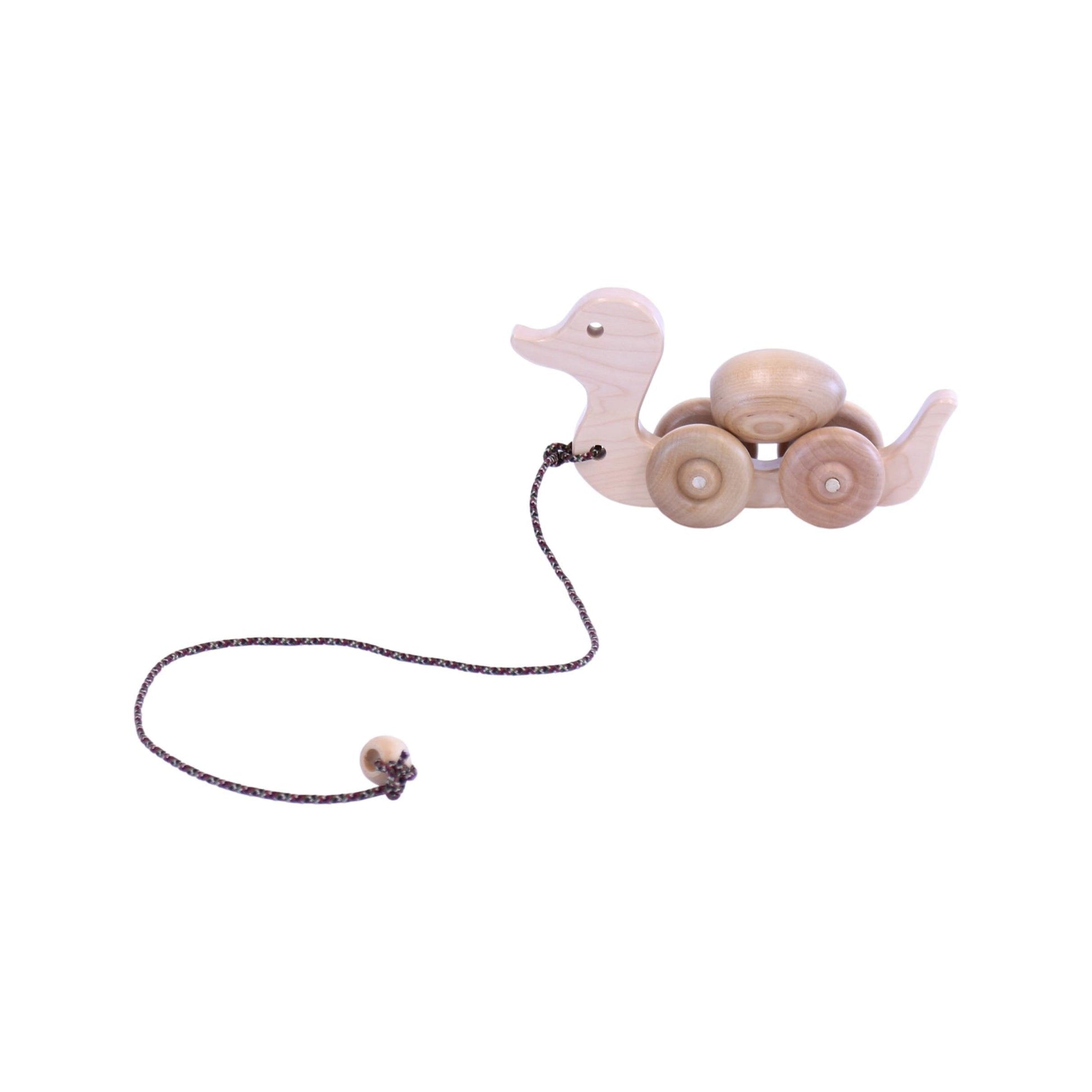 This wooden Duck pull toy is the perfect gift for a baby shower or for that special toddler in your life. Make their birthday or Christmas special with this unique duck pull toy that comes with a rolling egg on its back! The egg rests on the wheels, so as the wheels turn, the egg rotates! This wooden pull toy is hand-crafted in Shipshewana, Indian by our Amish friends. It is finished with a CPSIA approved, child-safe, non-toxic finish. The pull string on each duck may vary in color.